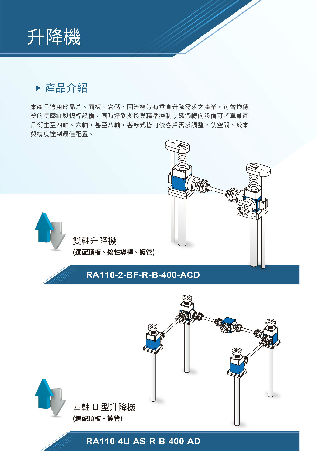 AS系列四軸升降機呈U型結構,選配頂板、護管。適用于晶片、面板、倉儲、回流線等有垂直升降需求的產業,可替換傳統的氣壓罐與蝸桿設備,同時達到多段與精準控制。