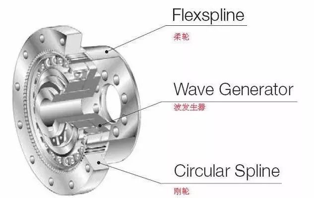諧波減速機由“柔輪、波發(fā)生器、剛輪、軸承”這四個基本部件構(gòu)成。柔輪的外徑略小于剛輪的內(nèi)徑,通常柔輪比剛輪少2個齒。波發(fā)生器的橢圓型形狀決定了柔輪和剛輪的齒接觸點分布在介于橢圓中心的兩個對立面。波發(fā)生器轉(zhuǎn)動的過程中,柔輪和剛輪齒接觸部分開始嚙合。波發(fā)生器每正時針旋轉(zhuǎn)180°,柔輪就相當(dāng)于剛輪逆時針旋轉(zhuǎn)1個齒數(shù)差。在180°對稱的兩處,全部齒數(shù)的30%以上同時嚙合,這也造就了其高轉(zhuǎn)矩傳送。